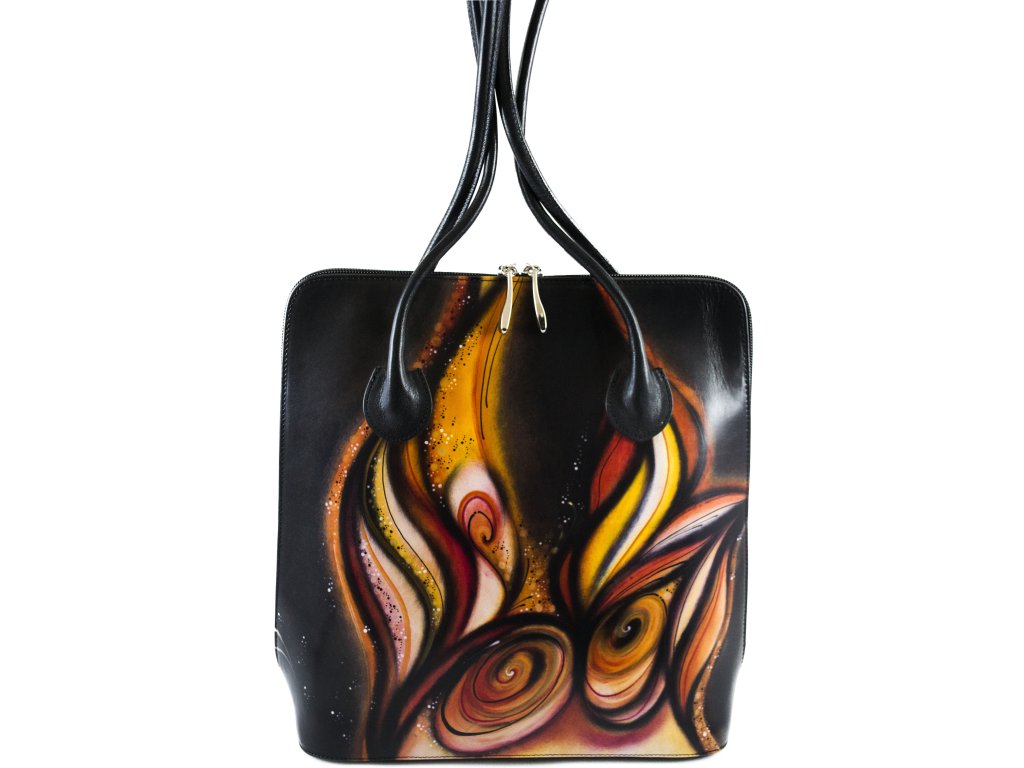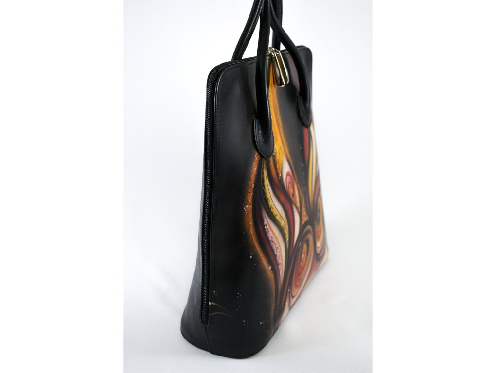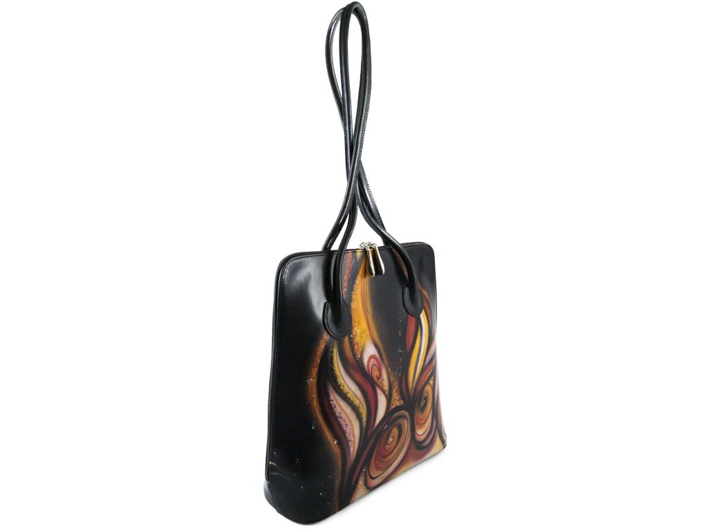 Větší kožená kabela značky Bambas s ruční malbou, klasického tvaru, vhodná i jako pracovní (lze vložit i objemnější složku ve formátu A4). Uzavírání zipem se dvěma jezdci (možno rozevřít téměř až ke dnu). Uvnitř jeden velký prostor, veliká boční kapsa, přihrádka na telefon a zipová kapsa.Doplňkové parametry