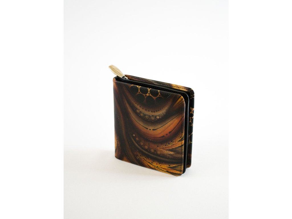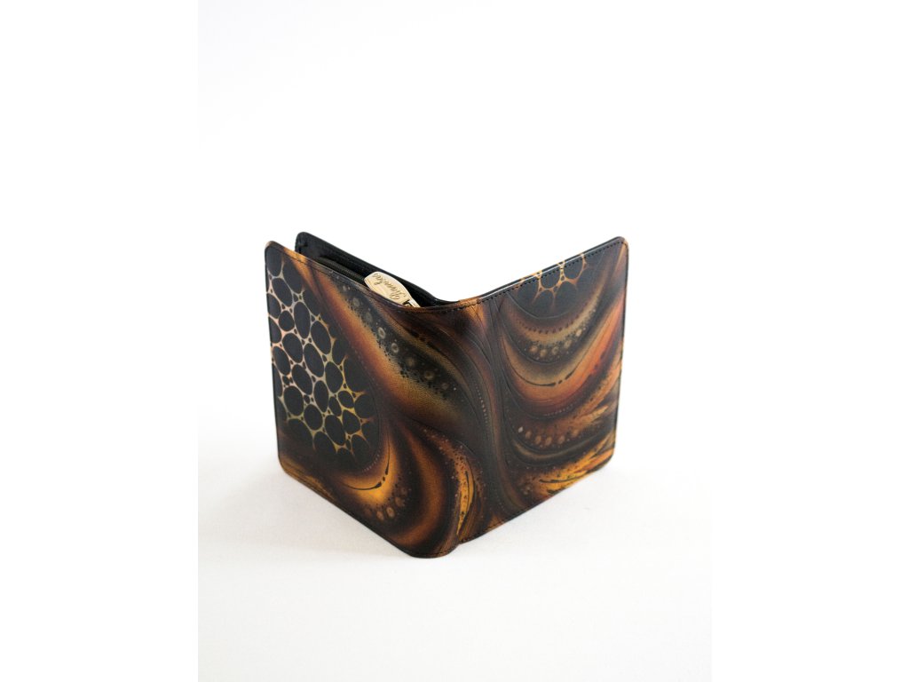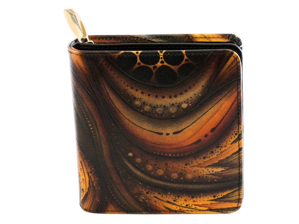 Dámská, kožená, ručně malovaná peněženka se zipovou kapsou na mince. Oddělení pro bankovky (dvě přihrádky) a platební karty (šest míst) zajištěn drukem. Kapsa na mince se dvěma přihrádkama. Vysoká kvalita šití a použitých materiálů.Doplňkové parametry