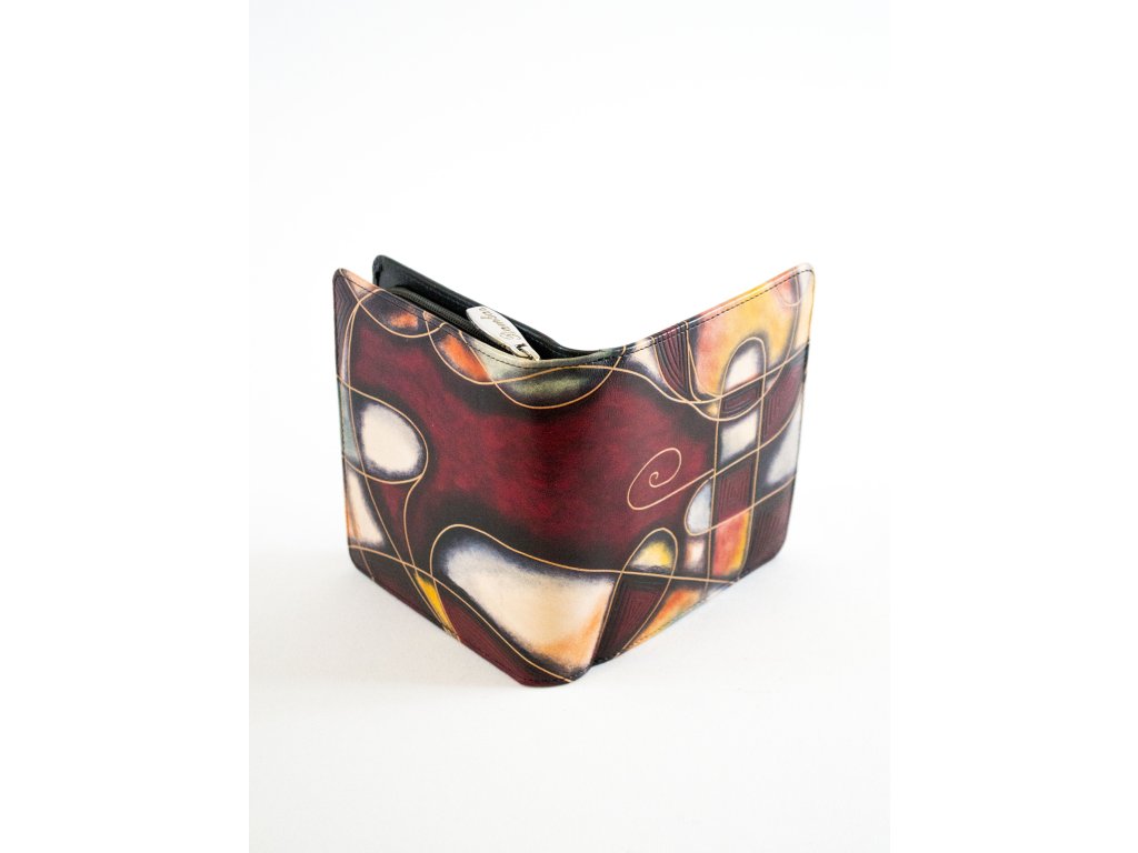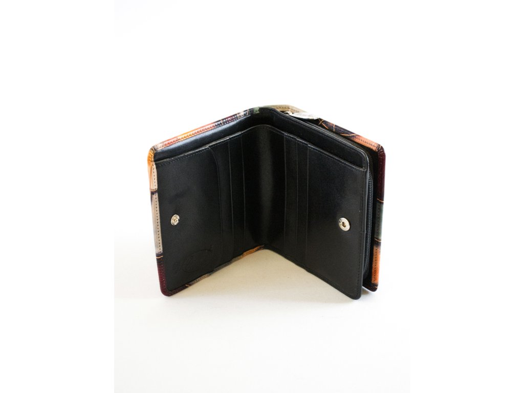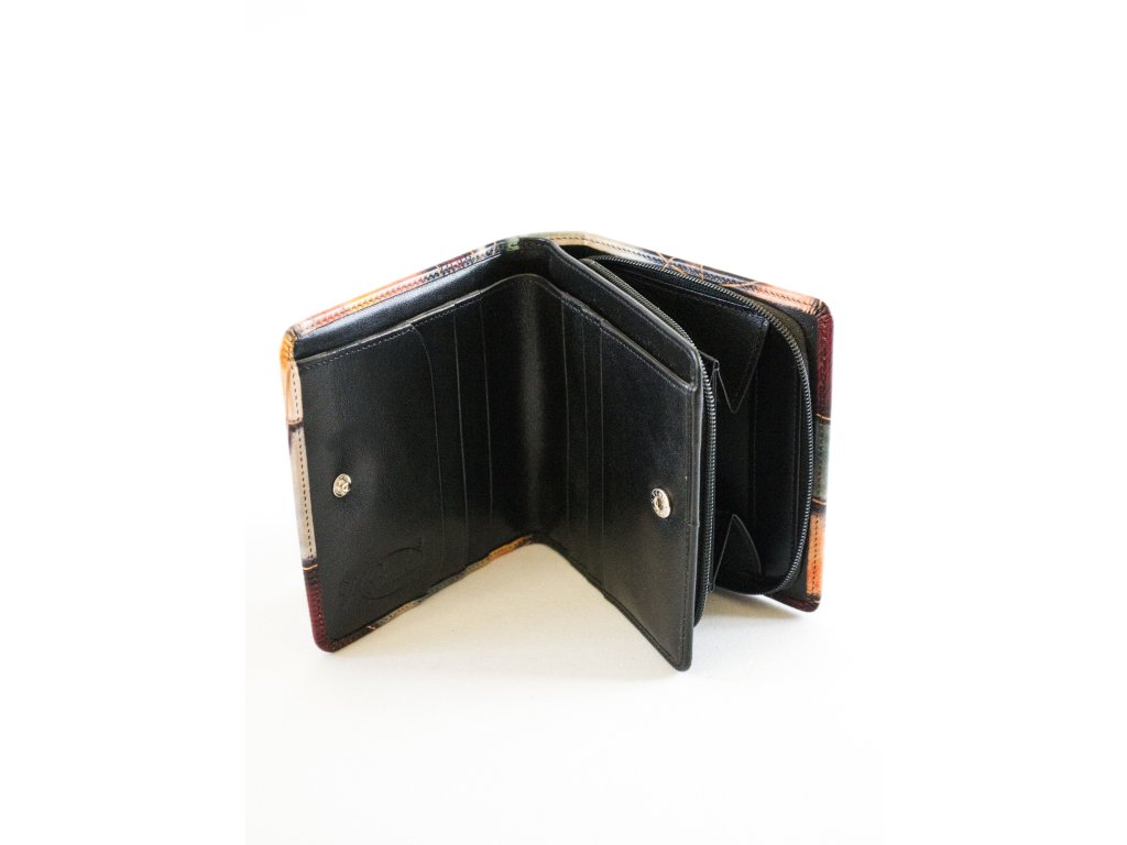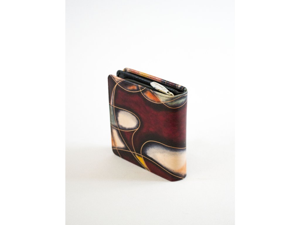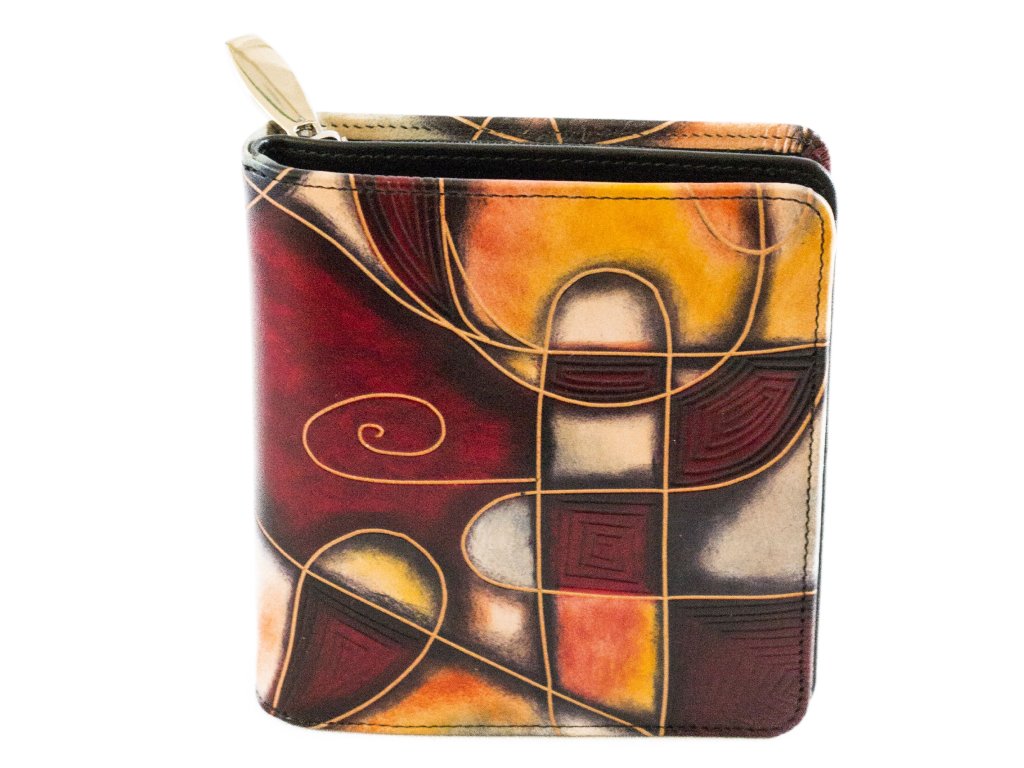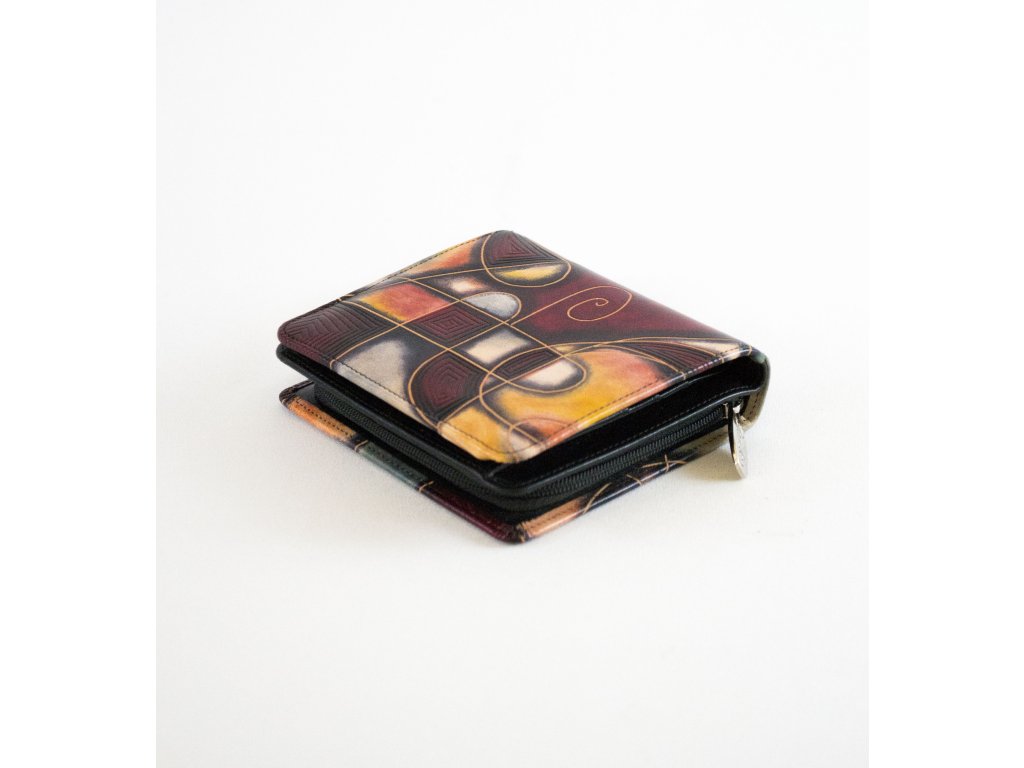 Dámská, kožená, ručně malovaná peněženka se zipovou kapsou na mince. Oddělení pro bankovky (dvě přihrádky) a platební karty (šest míst) zajištěn drukem. Kapsa na mince se dvěma přihrádkama. Vysoká kvalita šití a použitých materiálů.Doplňkové parametry