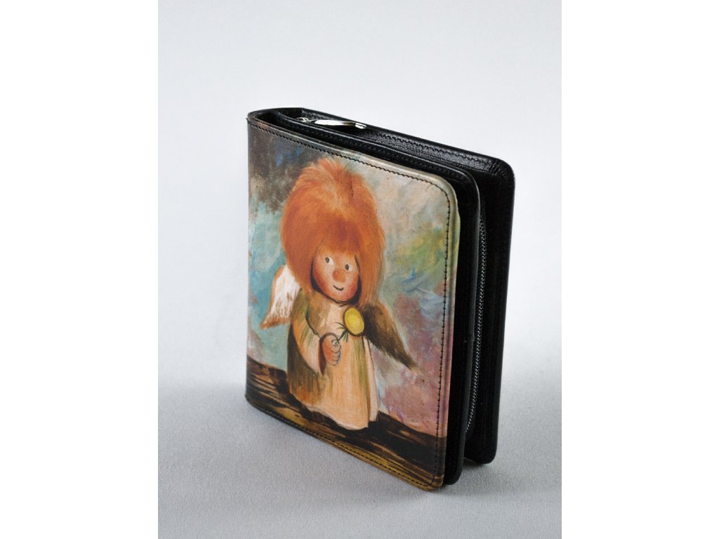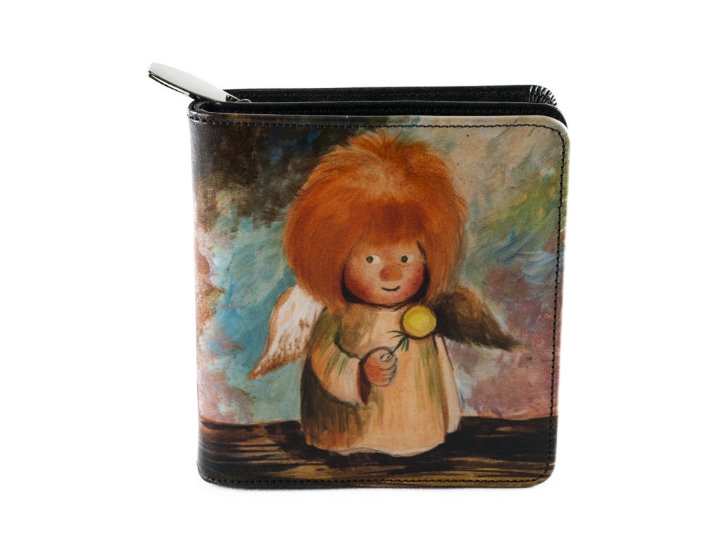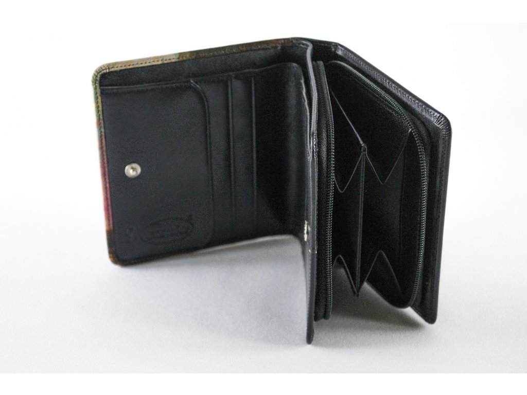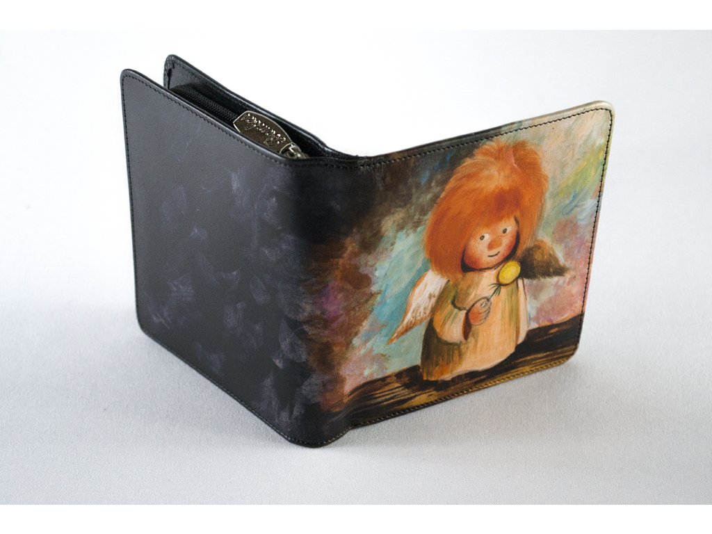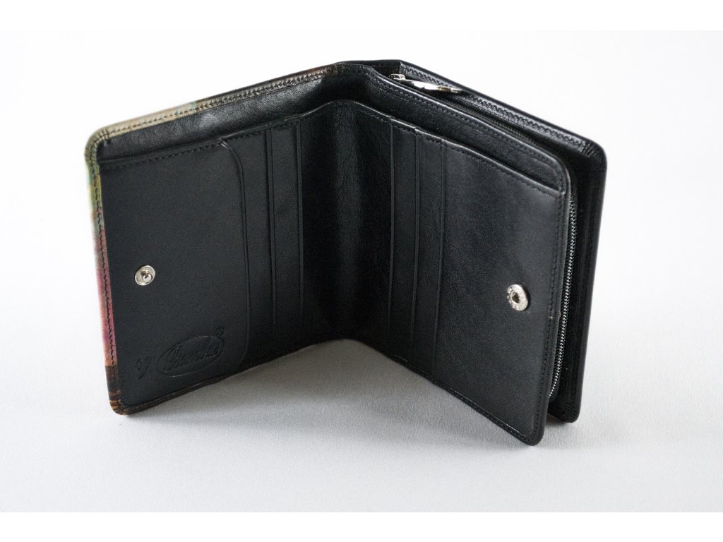 Dámská, kožená, ručně malovaná peněženka se zipovou kapsou na mince. Oddělení pro bankovky (dvě přihrádky) a platební karty (šest míst) zajištěn drukem. Kapsa na mince se dvěma přihrádkama. Vysoká kvalita šití a použitých materiálů.Doplňkové parametry
