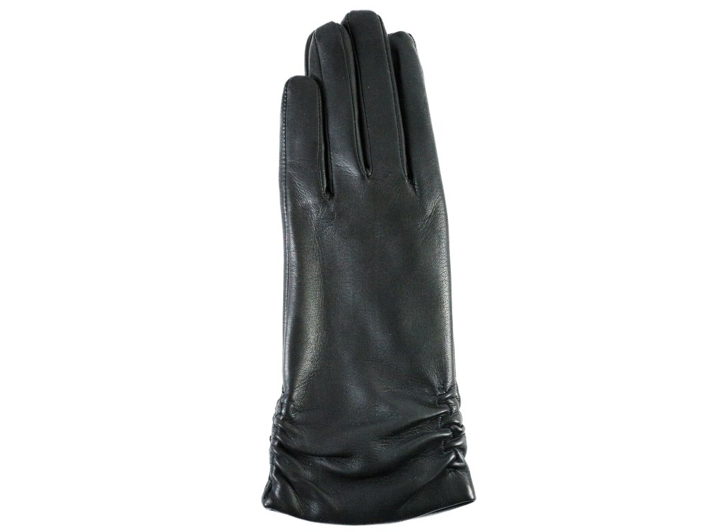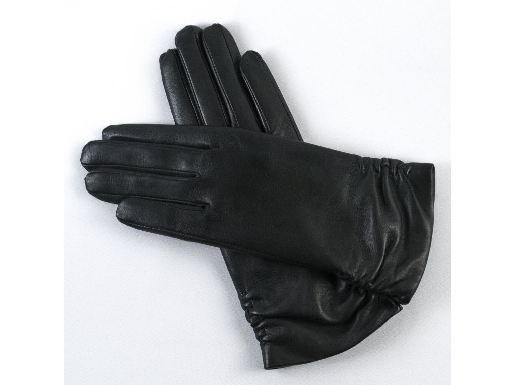Dámské, kožené rukavice zhotovéné z jehnětiny. Rukavice klasického, prodlouženého střihu. Rukavice jsou zdobeny řasením na zápěstí. Řasení bylo docíleno zapomoci gumičky, která zárověń brání před vniknutím chladu. Rukavice jsou zatepleny příjemnou, vlněnou podšívkou.Doplňkové parametry